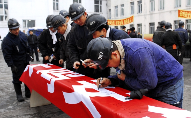 东山矿职工在安全生产承诺条幅上签名。 李雪摄
